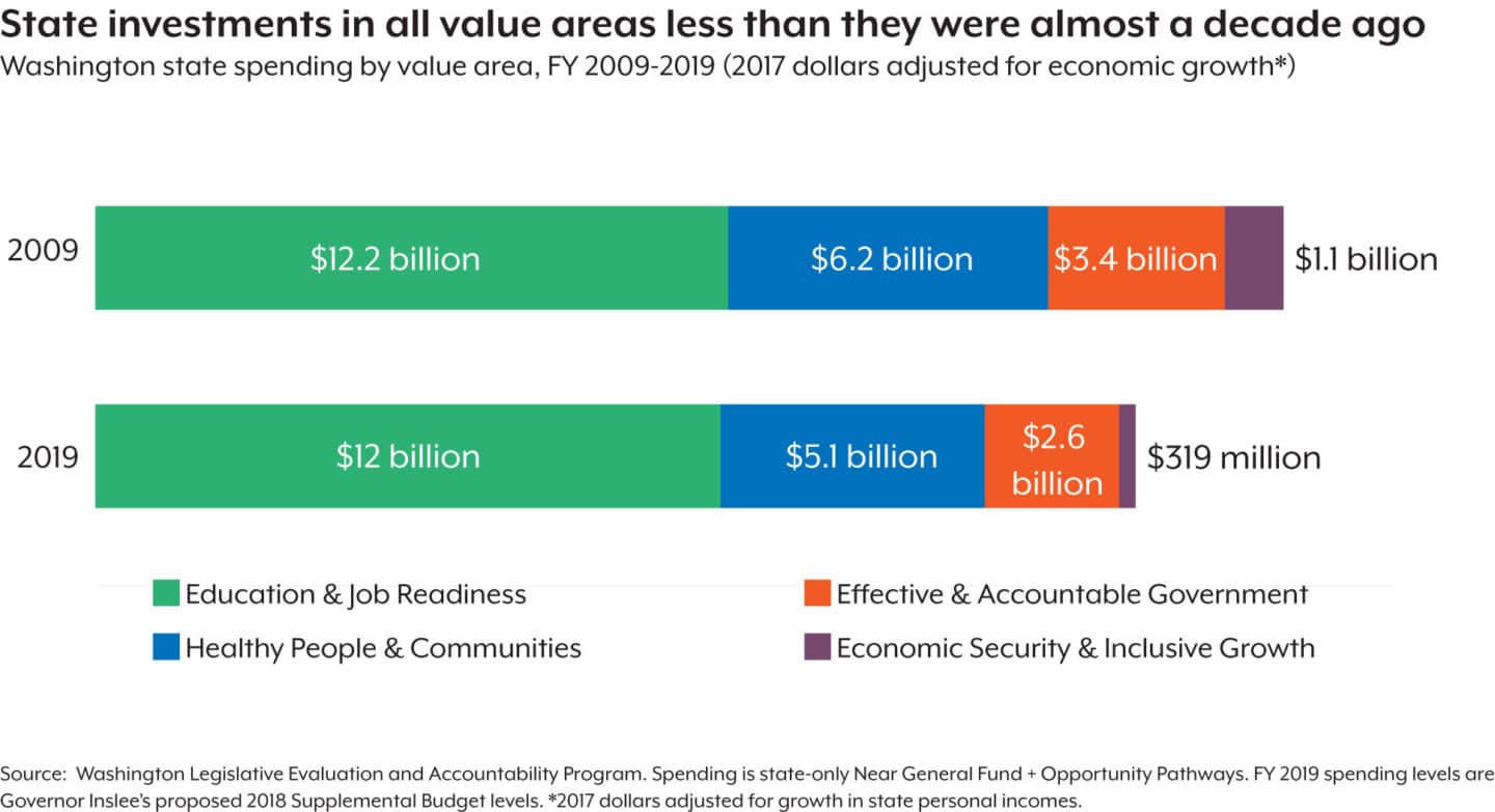 In the last several years, lawmakers made significant investments in public schools, but the reality is that those boosts don’t represent actual increases relative to economic growth. And even with the additional investments included in the governor’s proposal, state spending remains near historic lows. In today’s dollars, the proposed levels of overall community investments in our state are actually lower than Recession-level spending. As the chart below shows, education spending in the governor’s proposed budget for the 2017-19 budget cycle will not even reach the level it was at a decade ago. And investments in every other value area have dropped significantly since then. This is the big picture that lawmakers must focus on when they meet again in January.