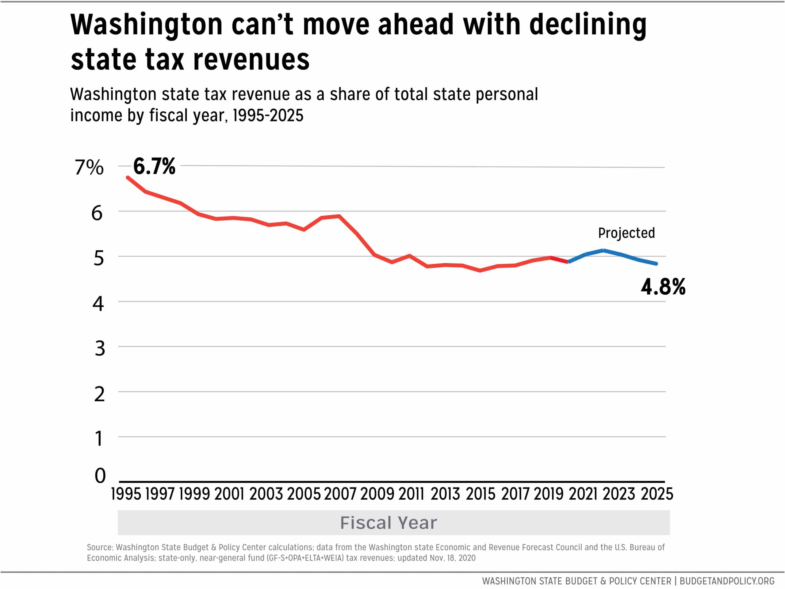 Equitable sources of new tax revenues will be needed to sustain Washington state’s economic recovery in the long run. The state will receive much-needed stimulus funding through the American Rescue Plan Act, but those funds will be exhausted by the end of 2024 even though ERFC projects the unemployment rate in Washington state will remain above pre-pandemic levels through at least 2025. Lawmakers have already learned the hard way that they can’t rely solely on the federal government to supply the funding needed to ensure a broadly shared, equitable recovery that can be sustained.
