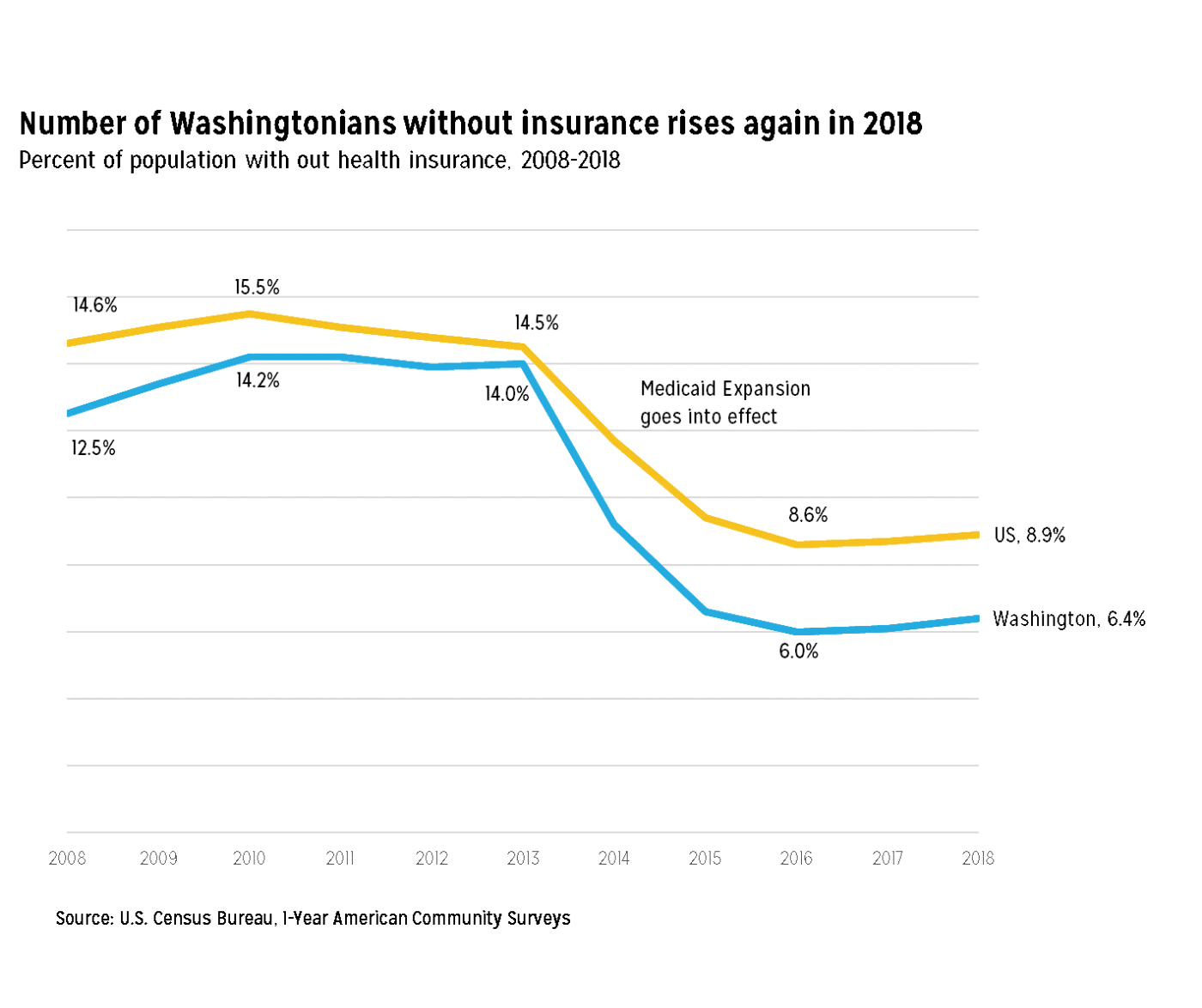 While the share of Washingtonians without health insurance consistently remains lower than the national average, the rate of people without insurance nevertheless rose from 6.1% in 2017 to 6.4% in 2018. That means roughly 477,000 Washingtonians – more than the population of Spokane and Tacoma combined – remain without insurance. This includes about 47,000 children and young people under age 19 in our state.