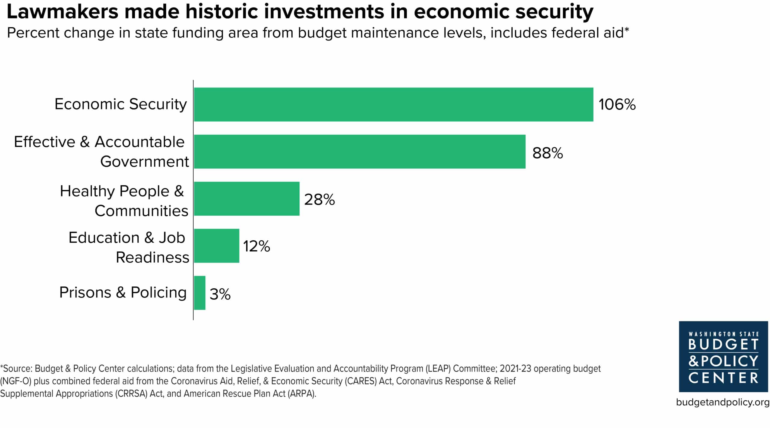 Although the new budget continues longstanding trends in how it allocates funding to specific areas of the budget – from Economic Security to Healthy People & Communities – all investment areas will receive a boost in funding relative to the amounts needed to sustain existing levels of community services. To help kids in preschool, K-12 schools, and colleges and universities recover and prosper in the years ahead, investments in Education & Job Readiness, the largest overall area of the state budget (Chart 2) will grow by 12% (Chart 3) in the new budget. Similarly, investments in Healthy People & Communities, which represents over one-quarter of the budget, will rise by 26%, to ensure communities, public health agencies, and health care providers have adequate tools to fight the ongoing COVID-19 pandemic. Funding that supports Economic Security investments for things like direct financial assistance will increase by 106%, the largest percentage increase of any value area. That bold investment will help people across the state weather the fallout from the deepest recession of the post-World War II era. However, it is worth emphasizing that despite this growth, Economic Security still remains the smallest area of the budget (2%), behind spending on Prisons & Policing (5%) – an area of our budget that we know perpetuates mass incarceration and militarization of police, disproportionately harming Black, Indigenous, and People of Color (BIPOC) communities.