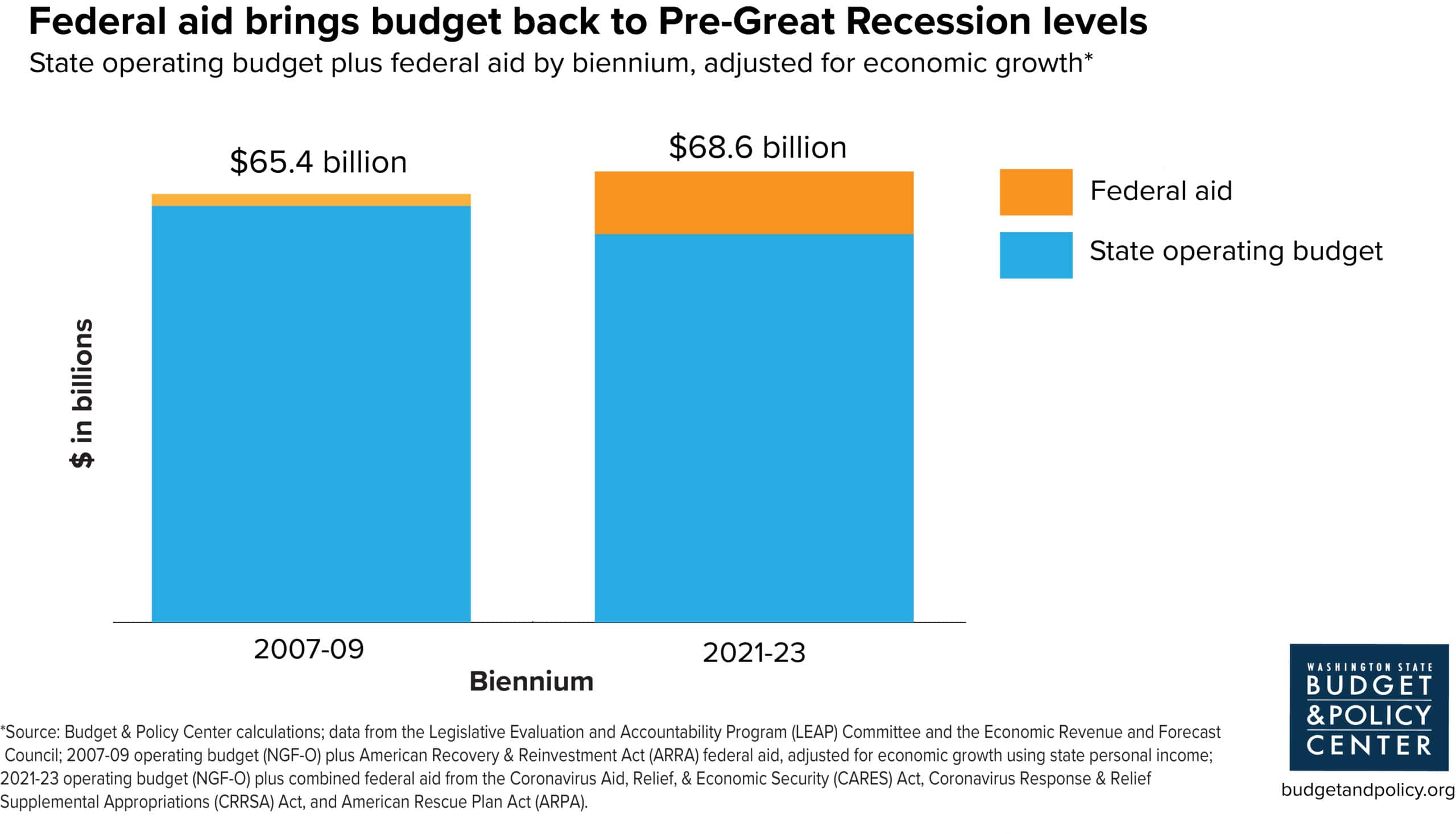 Emergency federal funding for states played a pivotal role helping Washington state lawmakers sustain and expand vital community investments. Federal actions in 2020 and early 2021 – which include the Coronavirus Aid, Relief, and Economic Security (CARES) Act, Coronavirus Response and Relief Supplemental Appropriations (CRRSA) Act , and American Rescue Plan Act (ARPA) – enabled state lawmakers to quickly respond to the public health and economic crises caused by the COVID-19 pandemic. These federal stimulus dollars funded emergency measures to keep people housed, fed, and healthy. And while immigrant communities were unjustly excluded from many emergency supports provided by the federal government, Washington state lawmakers responded to community advocacy to use federal stimulus funds to provide at least some financial assistance to undocumented communities during the crisis.